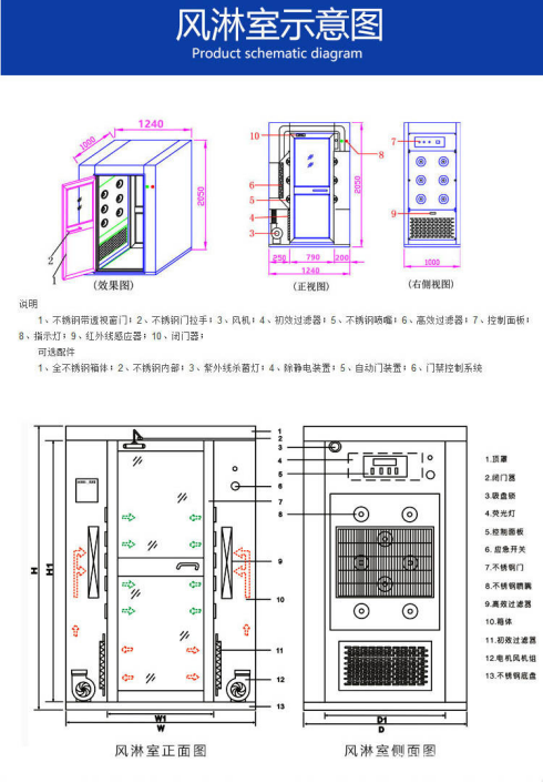 二、電機功耗小,此風淋室設計是進入風淋室吹淋,出門不吹淋,紅外線自動感應開關控制吹淋,避免風淋室無人空吹,多重節(jié)能。