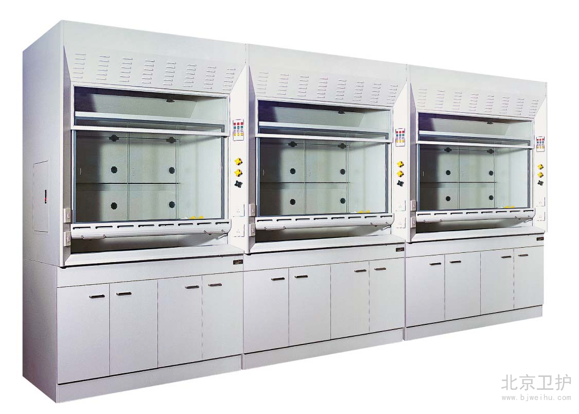 通風(fēng)柜是實(shí)驗(yàn)室家具中必不可少的一種。在實(shí)驗(yàn)室中起到排風(fēng)和換氣的功效。通風(fēng)柜的結(jié)構(gòu)是上下式,其頂部有排氣孔,可安裝風(fēng)機(jī)。上柜中有導(dǎo)流板,電路控制觸摸開關(guān),電源插座等 ,透視窗采用鋼化玻璃,可左右或上下移動(dòng)。供人操作。下柜采用實(shí)驗(yàn)邊臺(tái)樣式,上面有臺(tái)面,下面是柜體。臺(tái)面可安裝小水杯和龍頭。通風(fēng)柜的材料由多種的,全鋼、鋼木、全木、鋁木、塑鋼、PVC結(jié)構(gòu)等,其臺(tái)面是直接與操作者接觸的地方,由實(shí)芯理化板,不銹鋼板,PVC,陶瓷等材料組成。舊式通風(fēng)柜多用木材制成,但現(xiàn)代多為涂有環(huán)氧樹脂的鋼材制造。常見柜寬為1000、1200、1500、1800和2000毫米幾個(gè)規(guī)格,深700-900毫米,高1900-2400毫米。可供1-3個(gè)人同時(shí)使用。 通風(fēng)柜一般靠墻安裝。前方中間為可上下移動(dòng)的透明門(多為玻璃),開啟高度一般為100-600毫米。門后為實(shí)驗(yàn)進(jìn)行的工作面,有水管、下水道、電源、真空泵、氣路管線等實(shí)驗(yàn)需要的連接,上有帶保護(hù)罩的燈照明。空氣由柜內(nèi)前上方的排風(fēng)扇抽走后,或經(jīng)管道引到別處(稱為全通風(fēng)),或經(jīng)過濾重新循環(huán)使用(成為無管通風(fēng))。多數(shù)通風(fēng)柜在(1)排氣量過小(2)前方玻璃門開啟過大的時(shí)候會(huì)發(fā)出警報(bào),提醒操作者注意,一般玻璃門開啟后操作口風(fēng)速不應(yīng)低于0.5m/s,內(nèi)部的排風(fēng)扇速度和燈都有開關(guān)可調(diào)。使用的時(shí)候人站或坐于柜前,將玻璃門盡量放低,手通過門下伸進(jìn)柜內(nèi)進(jìn)行實(shí)驗(yàn)。由于排風(fēng)扇通過開啟的門向內(nèi)抽氣,在正常情況下有害氣體不會(huì)大量溢出。